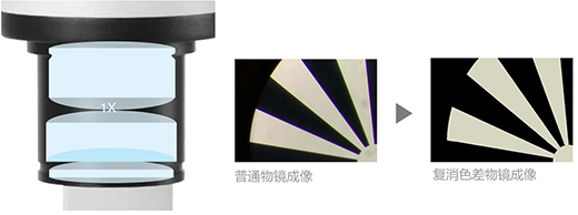 复消色差设计大幅度地提高物镜的色还原能力。通过校正红、绿、蓝色光轴向色差,使其同时会聚到同一焦点平面上,并有效校正紫色光的轴向色差,真实地再现被观测物体红、绿、蓝等颜色。WUMO 可提供 1X,2X 等多种复消色差物镜供选择。